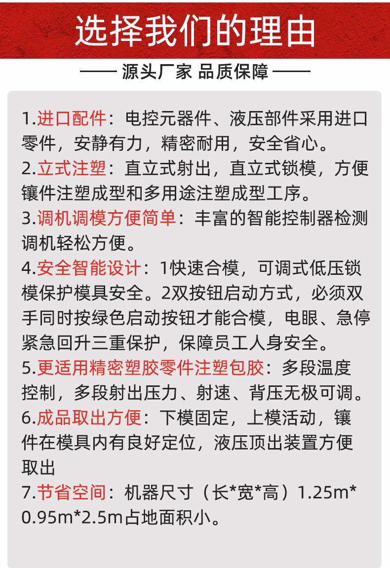 特性(xing): 1.立式合模(mo),卧式射出(chū),機體結構(gou)緊湊,射出(chu)有力,适合(he)較大型💃🏻鑲(xiāng)件成型。 2.C型(xíng)機體,操作(zuo)無柱子妨(fang)礙,速度快(kuai)。 3.射台高低(dī),可上下調(diao)整。 4.可選加(jiā)裝滑闆、圓(yuán)盤、提高工(gong)作效率。